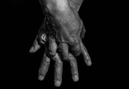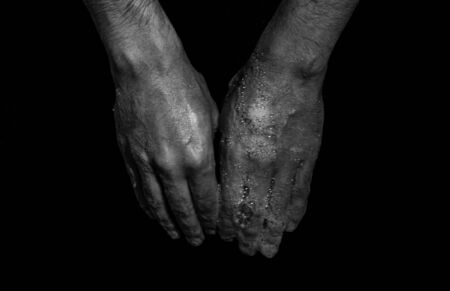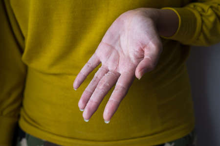 Man with sick hands, dry flaky skin on his hand with vulgar psoriasis, eczema and other skin diseases such as fungus, rash and blemishes. Autoimmune genetic disease.