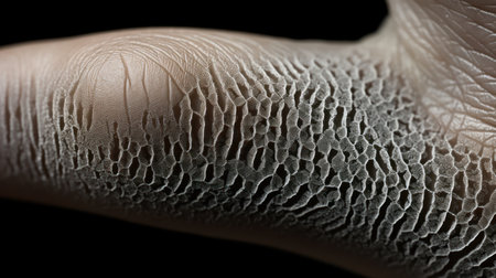An arm is extended with a textured surface reflecting various skin patterns and discolorations, set against a dark backdrop highlighting its details.