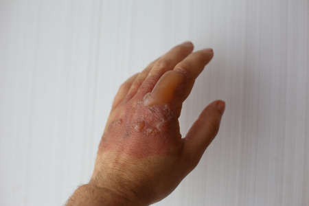 severe burn and blister on the hand, the palm burned with boiling water