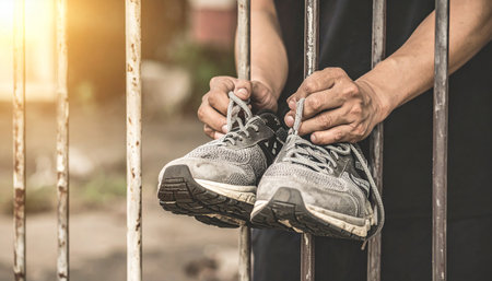 A person's hands hold a pair of grey and black running shoes through rusty prison bars, with sunlight in the background.