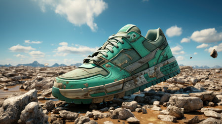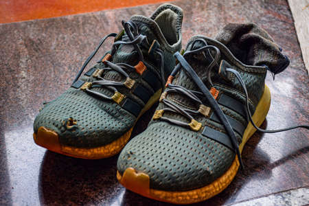 Stock photo of green color old dirty tear sports shoes kept on floor, Picture captured under natural light at Bangalore, Karnataka, India. focus on object.