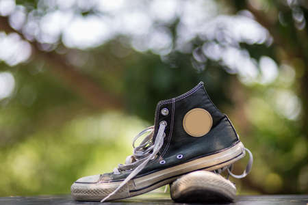 Old shoes black sneakers with bokeh background