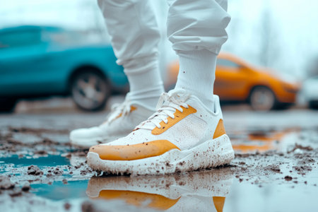 Muddy sneakers after outdoor run on wet dirty road