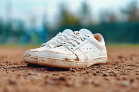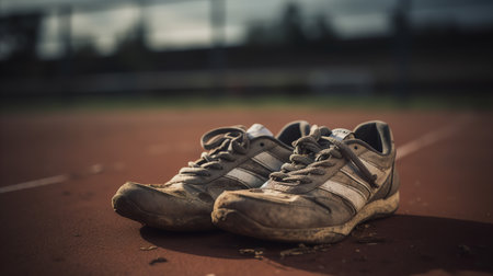 A pair of old, well-worn sneakers on a running track, emphasizing the concept of fitness dedication and determination.