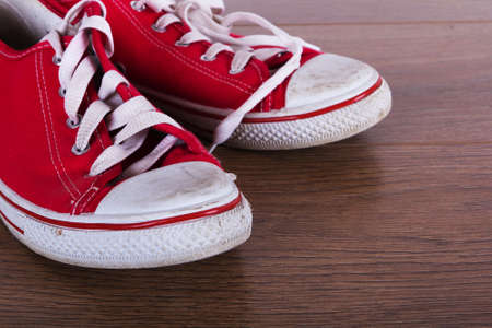 Old worn canvas shoes on a wooden floor