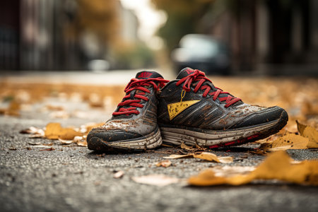 Old sneakers on the street in the fall. Selective focus.