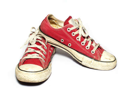 Old and dirty red sneakers on white