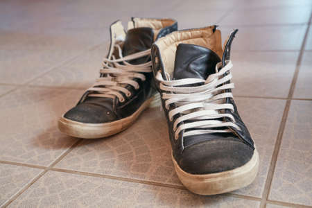 Old dirty sneakers on floor