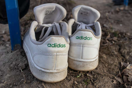 Rybnoe, Russia - 29 March, 2020: Old dirty Adidas sport shoes back view. Torn sneakers on the ground.