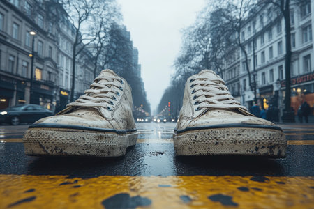 A close-up of worn sneakers standing on a city pavement marked with directional arrows. This image captures the essence of urban life and the style of gen z culture. ai generated.