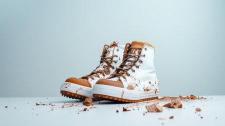 A pair of stylish white sneakers splattered with chocolate rests on a clean light background. The dynamic angle showcases the unique design and playful creativity in footwear fashion.