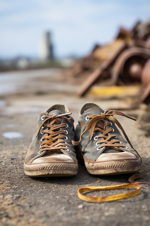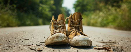 Weathered shoes walking a long road, journey without end, hope persists