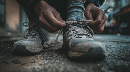 Close-up shot of a person's hands carefully tying the shoelaces of their sneakers on a textured asphalt surface. The image conveys a sense of preparation and self-sufficiency in an urban setting, highlighting a moment of focused personal detail.