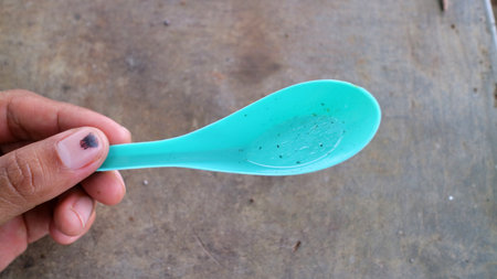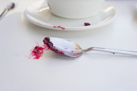 A spoon resting on a table with some colorful residue of berry jam spread on it