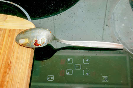 A metal dirty spoon lies on a wooden board. The process of food preparation.