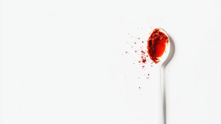 A close-up image of red chili spice on a spoon creates a striking visual against a clean white background, perfect for culinary inspiration and food photography.