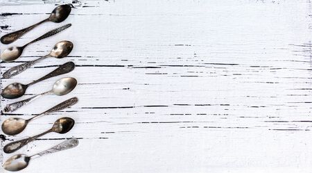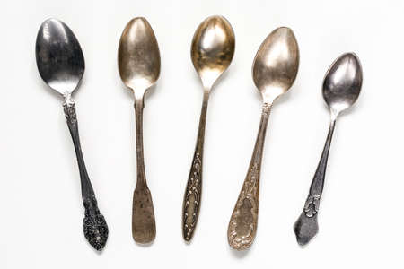 Vintage silverware, old tea spoons on white background. Table top view closeup