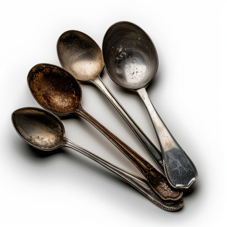 A visually striking collection of vintage silver spoons, showcasing various designs and textures against a clean white background, perfect for culinary-themed projects and nostalgia.