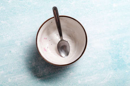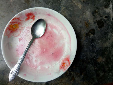 white bowl and red spoon after the finished the meal on the wooden table, dirty bowl