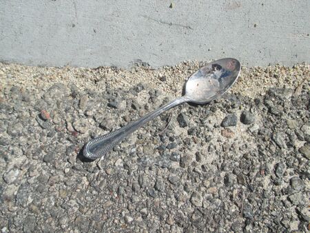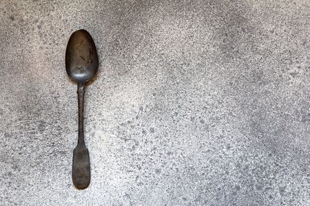 Antique silver spoon on gray concrete style. Vintage style. Top view.