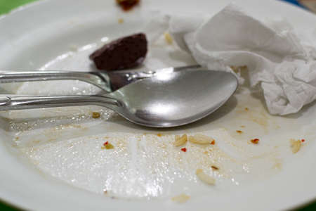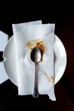 A vertical shot of a used spoon on a dirty napkin in a broken plate