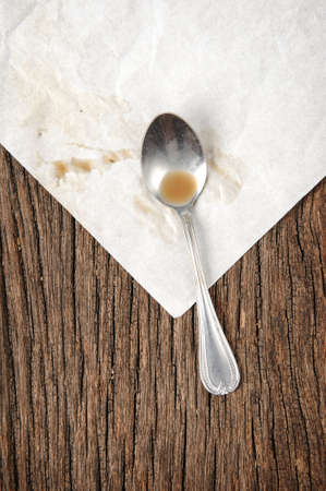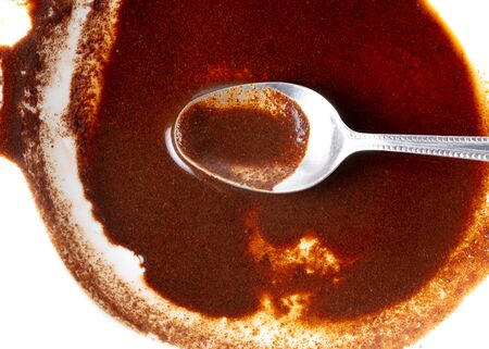 Coffee stain on metal spoon and white ceramic dish.Filtered image processed vintage effect.