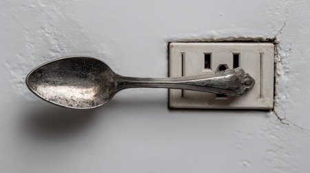 A vintage silver spoon awkwardly positioned in a wall socket, showcasing a mix of textures and an unusual perspective that sparks curiosity and humor.