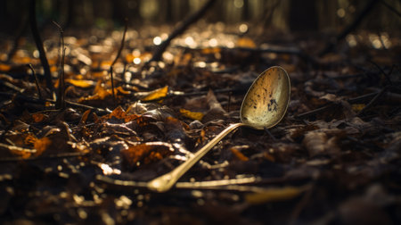 an old spoon rests amidst the serene beauty of the forest, captured with the sony fe 85mm f/1.4 gm lens. this uhd image showcases the essence of australian tonalism, with its realistic depiction of everyday life. the backlight adds a touch of enchantment, while the composition creates spatial illusions. a perfect representation of campcore aesthetics. ai generated