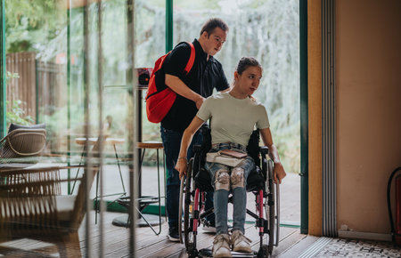 I am ok. Close up of the modern wheelchair and disabled person standing next to it with his social worker