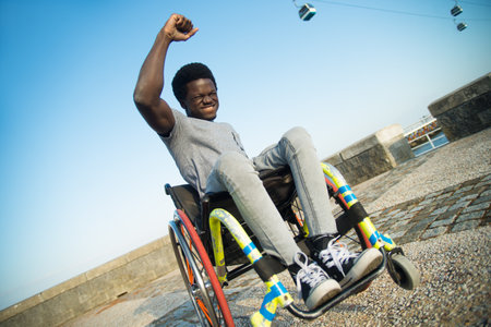 Happy African American man having walk on summer day. Man in wheelchair in casual clothes on embankment, smiling, gesturing, raising hands. Portrait, beauty, happiness concept