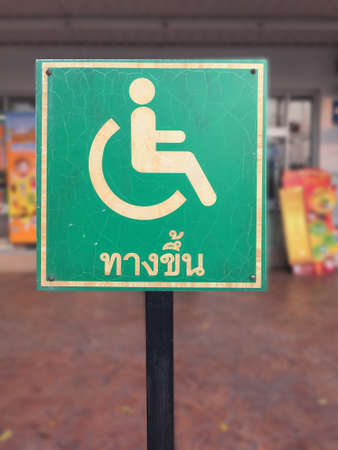 The green sign of ramp for wheelchair. Thai text : ascent. The sign of accessible pathway for disabled people.