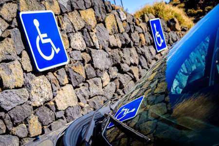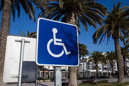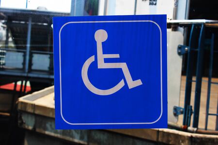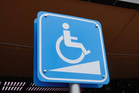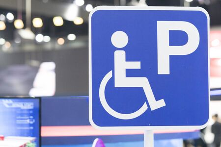 Blue Handicap at parking car sign outdoors for Disabled, Wheelchair or elder old or cannot self help people