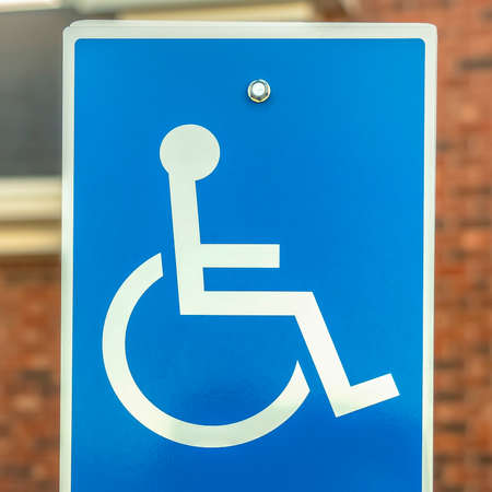 Square frame Close up of Handicapped Parking sign against blurred red brick wall of church. Blue and white sign with an icon of a person on a wheelchair at the parking lot.