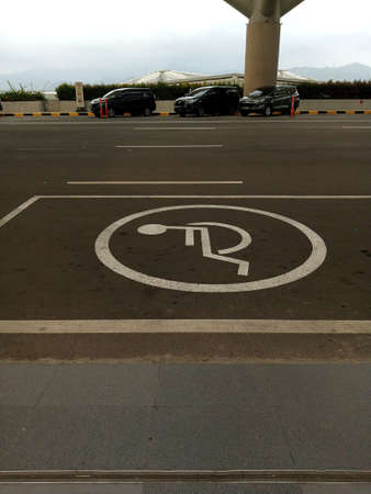 disabled parking or Wheelchair parking sign In the parking lot of the mall, Do the parking for the disabled, Slope area for wheelchairs.
