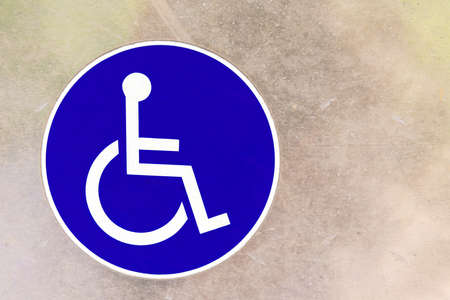 Close up of round blue sign with white symbol of person in wheelchair on textured background indicating person with disability
