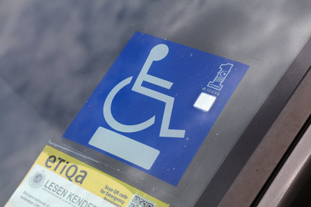 KUCHING, MALAYSIA - MARCH 10, 2024: Official windshield sticker for disabled driver car parked in Kuching, Malaysia.