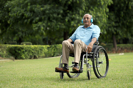 Disabled person in a wheelchair listening to music with headphones, enjoying and smiling