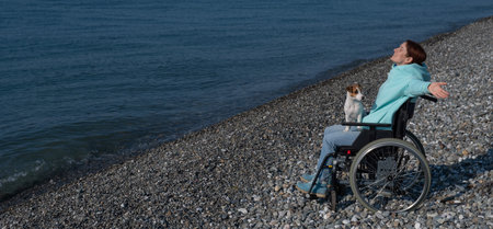 A serene Caucasian woman in a wheelchair is resting on the seashore with a jack russell terrier dog.