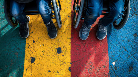Two individuals in wheelchairs on a colorful painted street in daylight