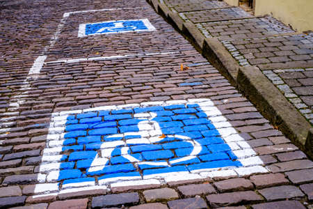 Grunge painted parking symbol for disabled in the old part of the city.