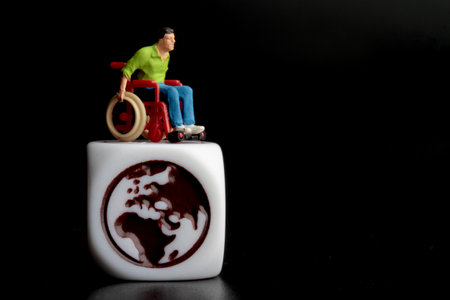 Miniature people : Wheelchair and wheelchair with world map on black background