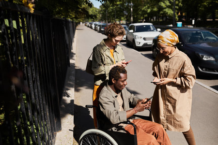 Group of young multi-ethnic friends with disabled man in wheelchair using gadgets on street