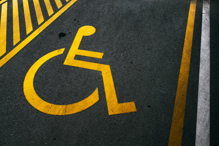 Yellow disabled parking symbol painted on asphalt. High angle view.