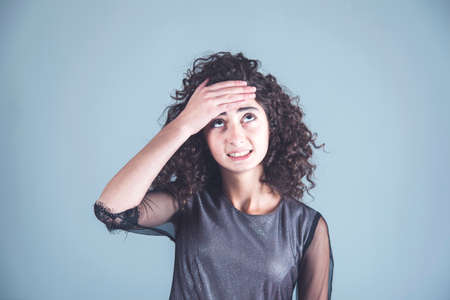 Portrait of a bearded young man of twenty-five, in black, holds his hand to his head, suffers from a headache. On a gray background