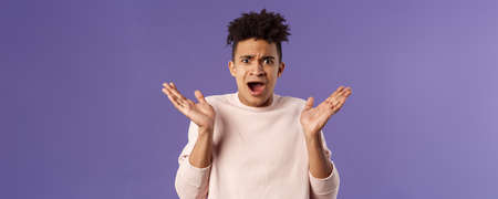 Close-up portrait of displeased, bothered frustrated hispanic man spread hands sideways in dismay and confusion, staring camera upset with disappointed grimacing expression, purple background