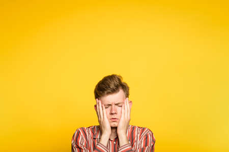 sad rueful depressed cheerless man covering his face in hands. portrait of a young guy on yellow background popping up or peeking out from the bottom. copyspace for advertisement.