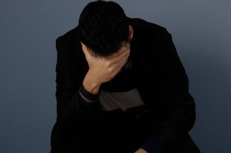 A young man hides his eyes with his hands. Sad man sitting covering his face. The guy sitting alone and going through. The concept of depression and grief. Unrequited love.