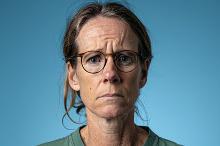 A woman with glasses stars intently at the camera, her expression a blend of focus and quiet contemplation.