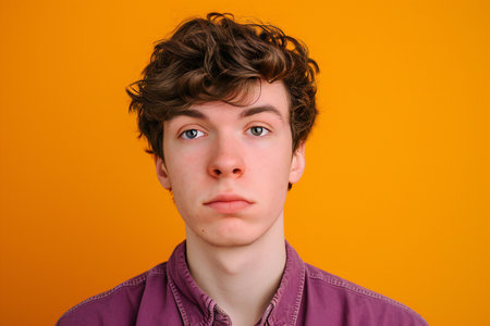 A young man with tousled brown hair and striking blue eyes gazes directly at the camera, his expression a mix of surprise and curiosity. The soft, neutral background enhances his expressive features, creating an intimate and engaging portrait that captures a moment of genuine emotion.