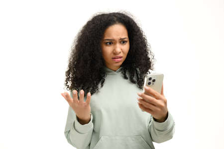 Disappointed young African-American woman holding smartphone and watching at the phone screen, lady received bad notification or messages, feels upset, shrugging, isolated